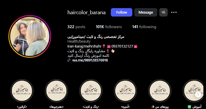رنگ مو آمبره و سامبره تو مهرشهر گرونه؟ آندیا فلاح تا آخر ماه تخفیف ۴۰٪ داره (موه بلند ۱/۸۰۰ تومن). مینا میرزایی هم با چک تا ۳ قسط قبول میکنه.
